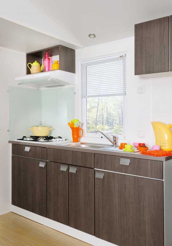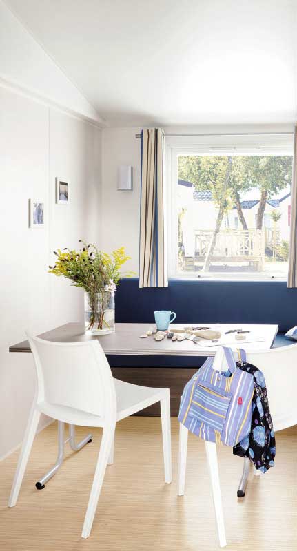 Le Mobil-home Ophea fait environ de 27.30m², 4 personnes, 2 chambres. Une chambre parents spacieuse et une chambre enfants pour le confort des petits.